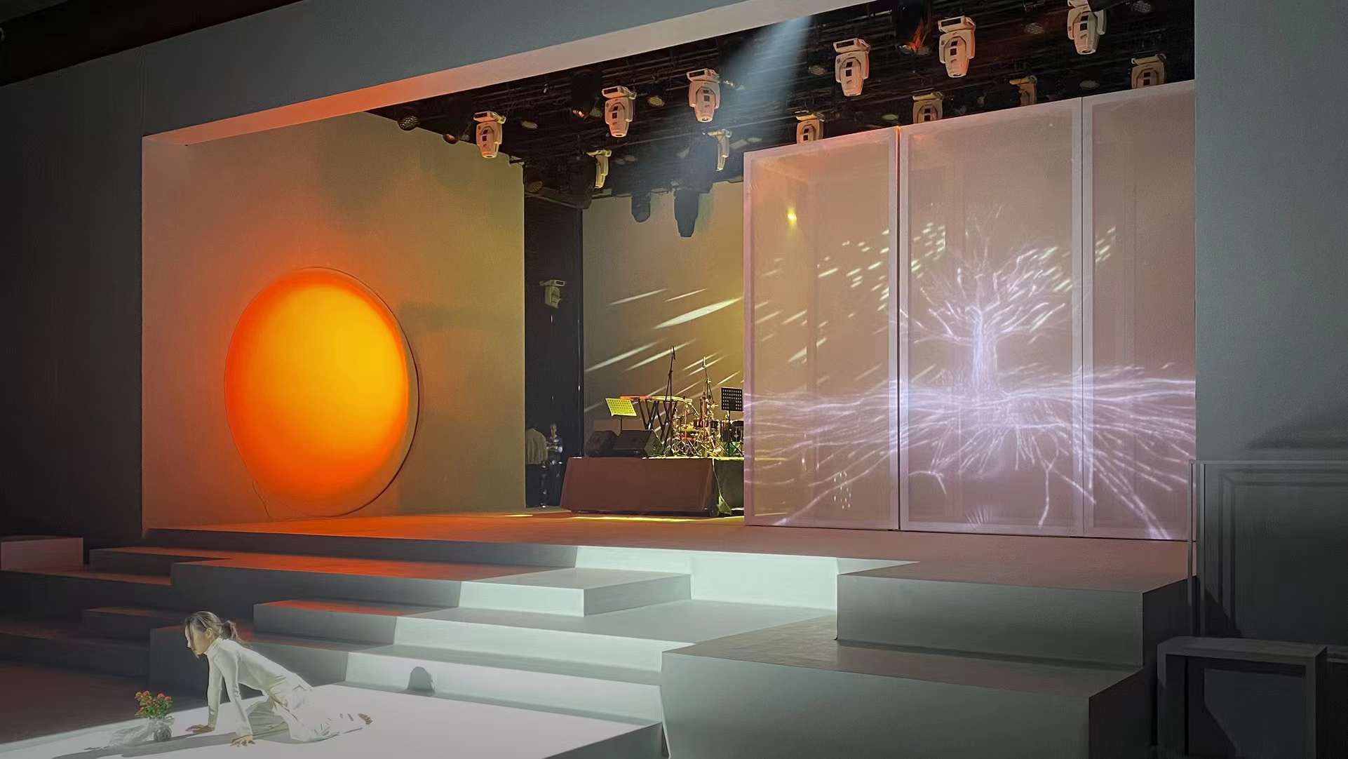 谢欣舞蹈剧场的舞者由场外开始舞动,引导参与本次盛典的嘉宾进入现场。两块纱幕落下,舞剧《静地回升》片段为颁奖盛典拉开序幕。自天空降下的桌子、椅子、灯在舞台上营造了一个“家”的意象。灯是温度,表示家里有人;桌子是结构,代表稳固的支撑体。当桌子倾斜,凳子失重,日记被打开,舞台上的一切仿佛亦真亦幻,进入了一个介于真实与虚拟之间的时空。