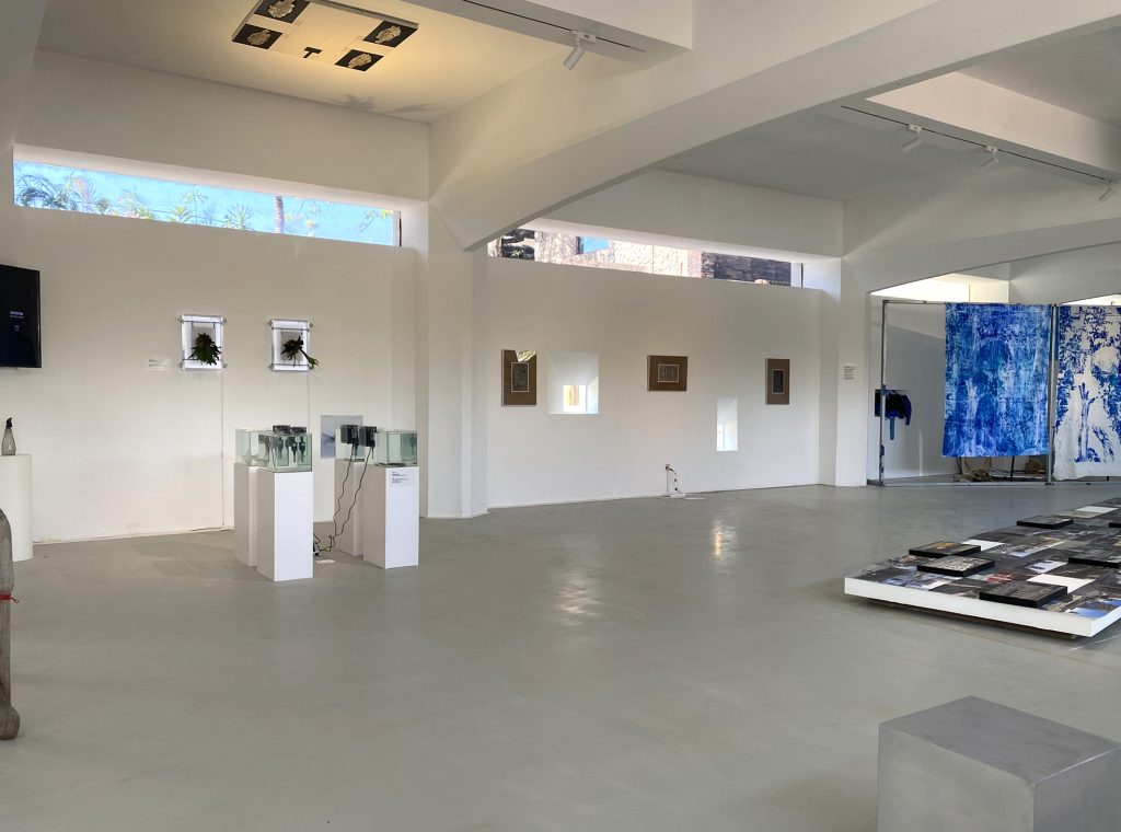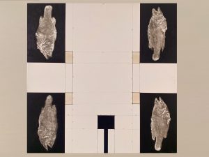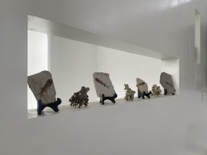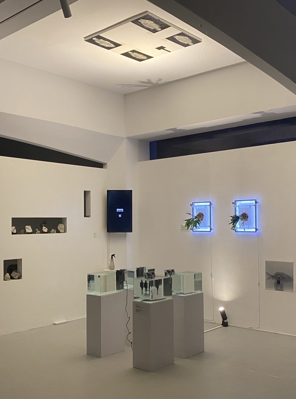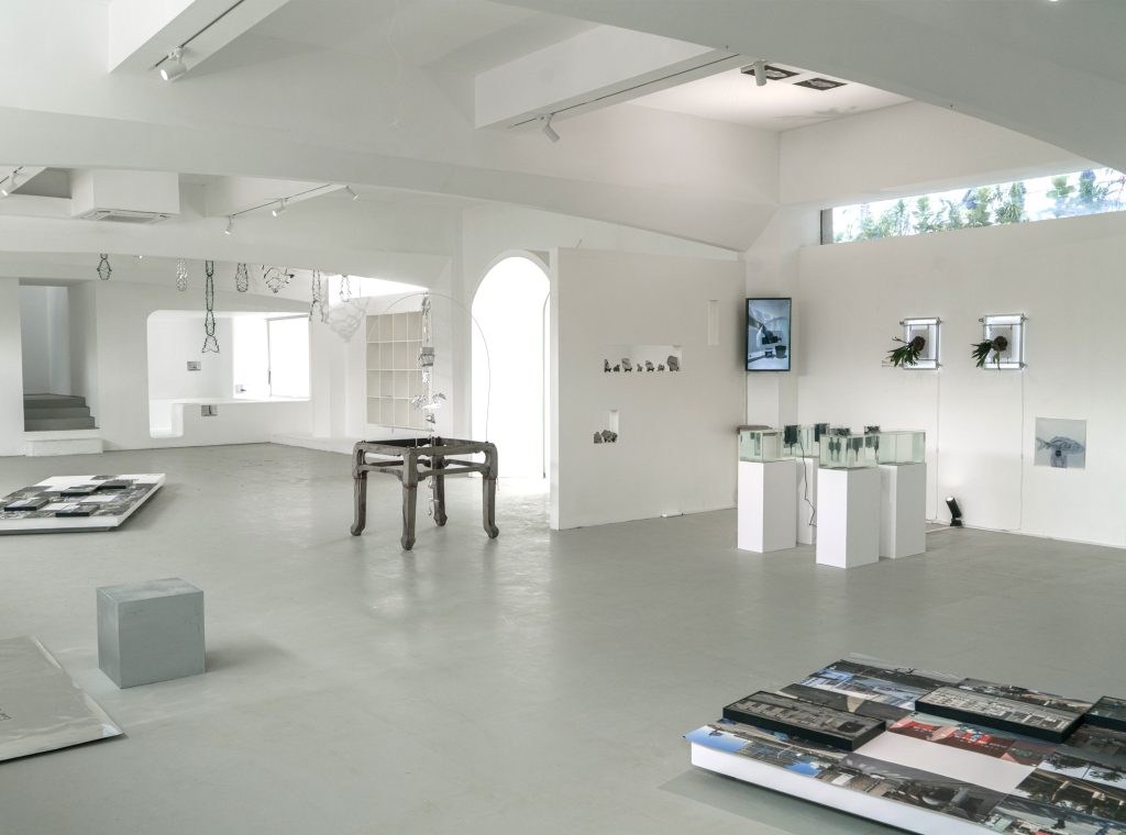 By deliberately controlling the depth of traces and the reality of objects during the printing process, we can glimpse the artist’s symbolic comparison of subjective memory experiences and descriptions of forgetfulness that are often mentioned in our daily lives. The painting hanging at the top implies a re projection and differentiation of individual memory, providing material evidence for our retelling and depiction in collective memory. The arrangement of ancient fish fossils from the vicinity of Chaoyang and corals picked up from the Chaomu seaside shows the artist’s rotation and nesting of macro geographical landforms. And the transplantation of Hainan fern plants on cold metal is a direct appropriation of the concept of “epiphytes” in the context of plants. In terms of material and media, ‘Start When Leaving’ utilizes the five elements that construct the rotation of all things, while in terms of overall exhibition, the series employs a three-layer spatial relationship of sea, mountain, and sky for layout.