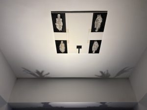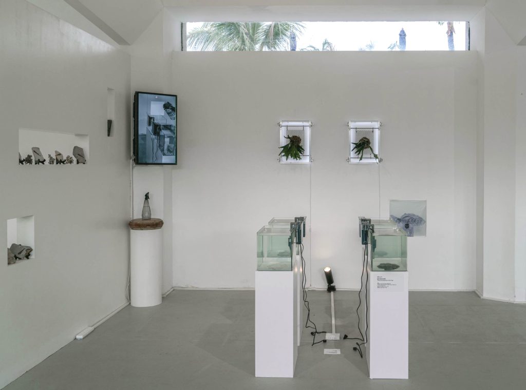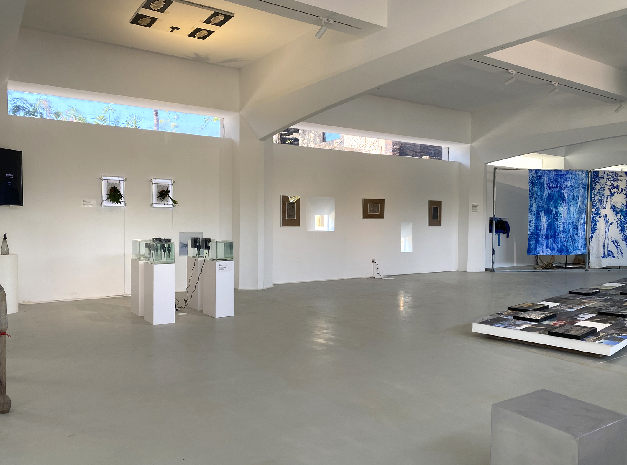 通过对于拓印过程中所刻意控制的痕迹深浅及物象虚实可以窥见到艺术家对于我们日常中所常被提及到的关于个体主观的记忆经历、描述忘却所做的象征性比拟。在位于顶部所悬挂的绘画则是暗指对于个体记忆所进行的再次投射分化,它也为我们在群体记忆中的转述与描摹提供了物料化佐证。在对产自朝阳附近的远古鱼化石与来自朝暮海边所捡拾的珊瑚进行对仗布局,显现了艺术家对于宏观的地理地貌进行的轮转嵌套。而在位于冷峻金属上对于海南蕨类植物的移植,更是对于“附生植物”这一在植物语境下“副本”概念的直接挪用。《离开时开始》在材料媒介方面,运用了构建万物所轮转的五元素,而该系列作品在整体展陈方面,运用了海、山、天的三层空间关系进行布局。