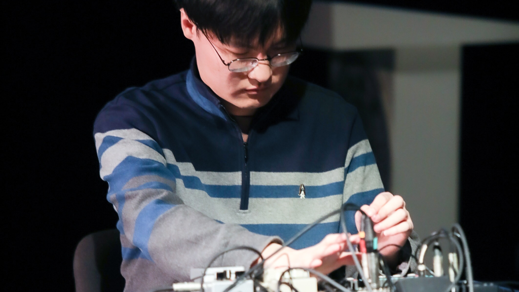 因此,在这次“哲学-戏剧”学术域中置入一些天线、食蚁兽、光、赤足、乐器与非乐器,身体与机器。这些肉体与电子元件以不同的交往方式呈现出艺术与技术的生成序列。