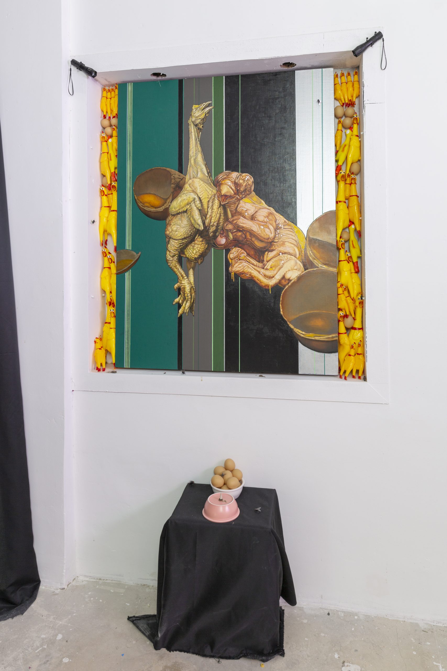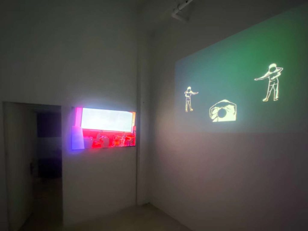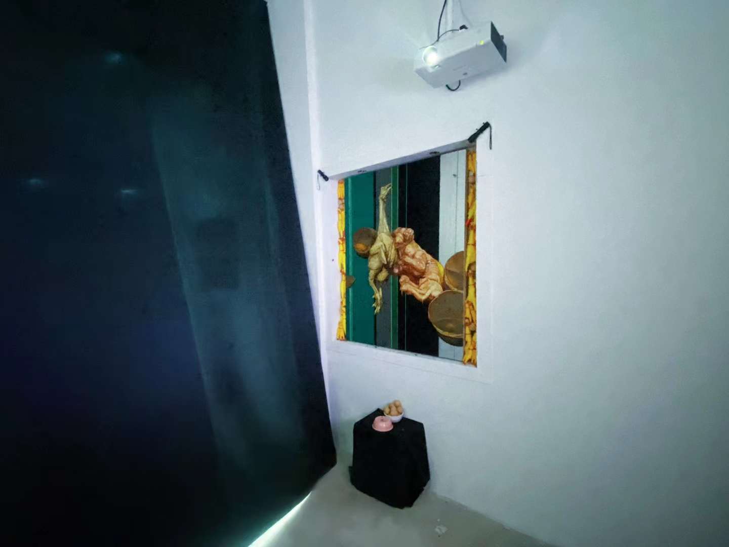 中间的基调是有关于“投射“或“映照”。是我与其他人的关系,这里既有各类合作者、合伙人,也有同修者、朋友或是其他人物对象。类贡品陈列的“龛”位与画,联动其对面墙壁上的动画作品,是坚硬的“喙”与被阉割的超验。而四处蛰伏的果蝇则肆意嘲笑那些本就消磨的假想与表达,是顺应也是流失。