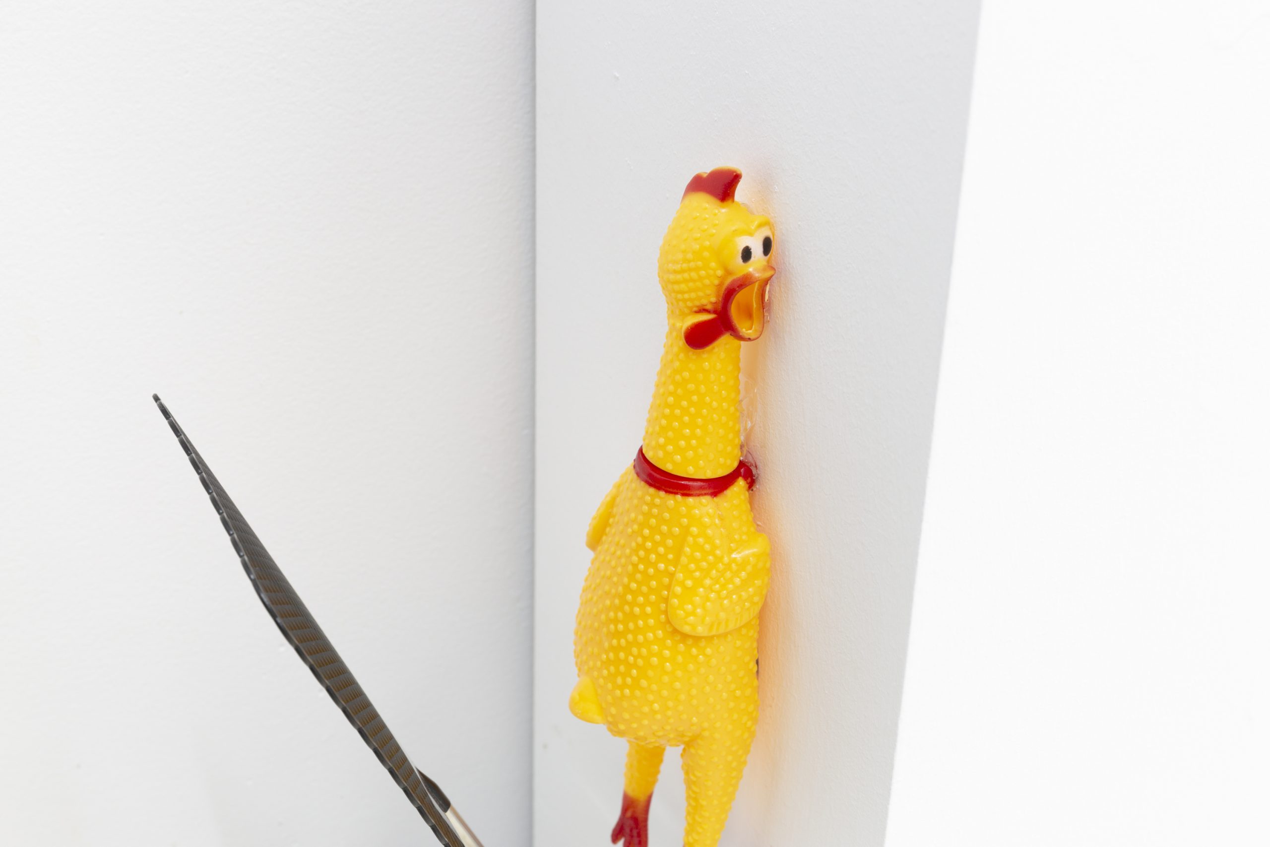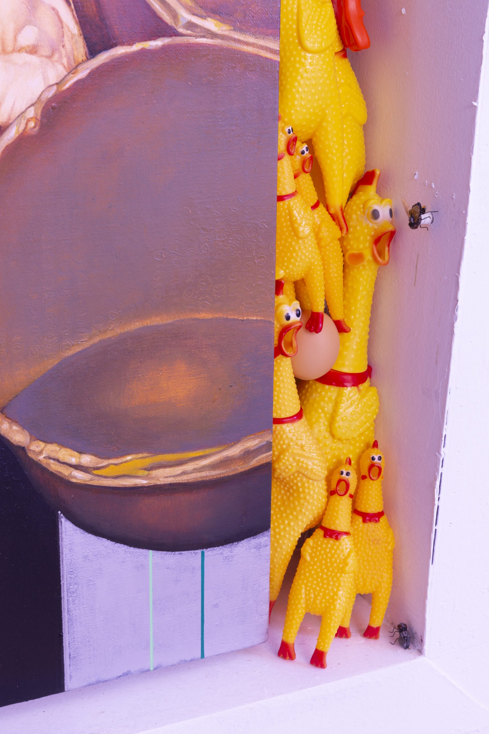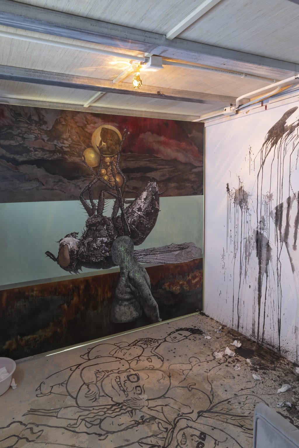 中间的基调是有关于“投射“或“映照”。是我与其他人的关系,这里既有各类合作者、合伙人,也有同修者、朋友或是其他人物对象。类贡品陈列的“龛”位与画,联动其对面墙壁上的动画作品,是坚硬的“喙”与被阉割的超验。而四处蛰伏的果蝇则肆意嘲笑那些本就消磨的假想与表达,是顺应也是流失。