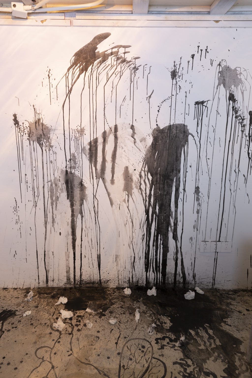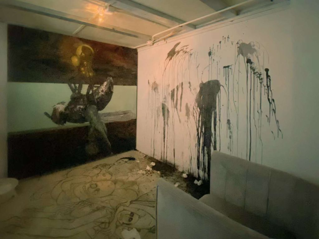 最内部的基调则是类似个人自白式的呓语,是我与自己的关系。肮脏与清洁、无序与规训,是被践踏的涂鸦和邪淫的墙面。只有布阵的旗帜僵化在无风的昏暗灯光下被注视。
